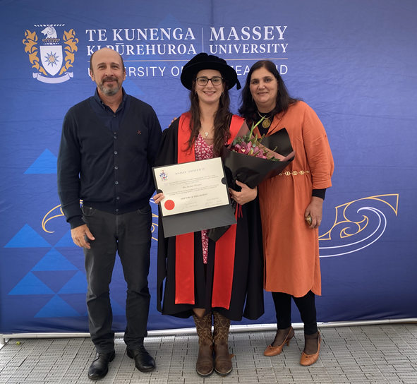She’s quick to credit those who supported her. “My supervisors – Professor Ignacio Lopez Campbell, Dr Lydia Cranston, Professor Emeritus Peter Kemp, Professor Danny Donaghy – were incredible. And the technicians, Mark Osborne and Brian Smith, they were out on the farm with me and taught me so much. And of course, my partner Harry, who I met here, and my parents – they flew all the way from Brazil for the graduation ceremony.”