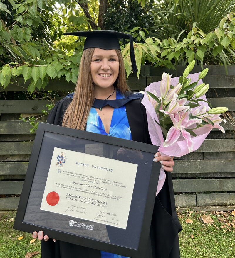Growing up in rural Waikato, Emily Clark developed a deep appreciation for both the land and the people who work it. “That connection to the rural sector has always been at the heart of who I am, and it’s what led me to Massey University, where I recently graduated with a Bachelor of Agribusiness, majoring in farm management,” she says.
