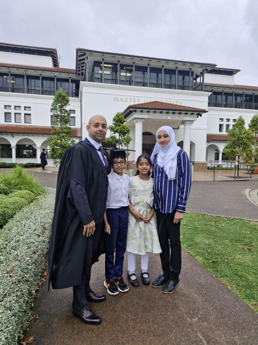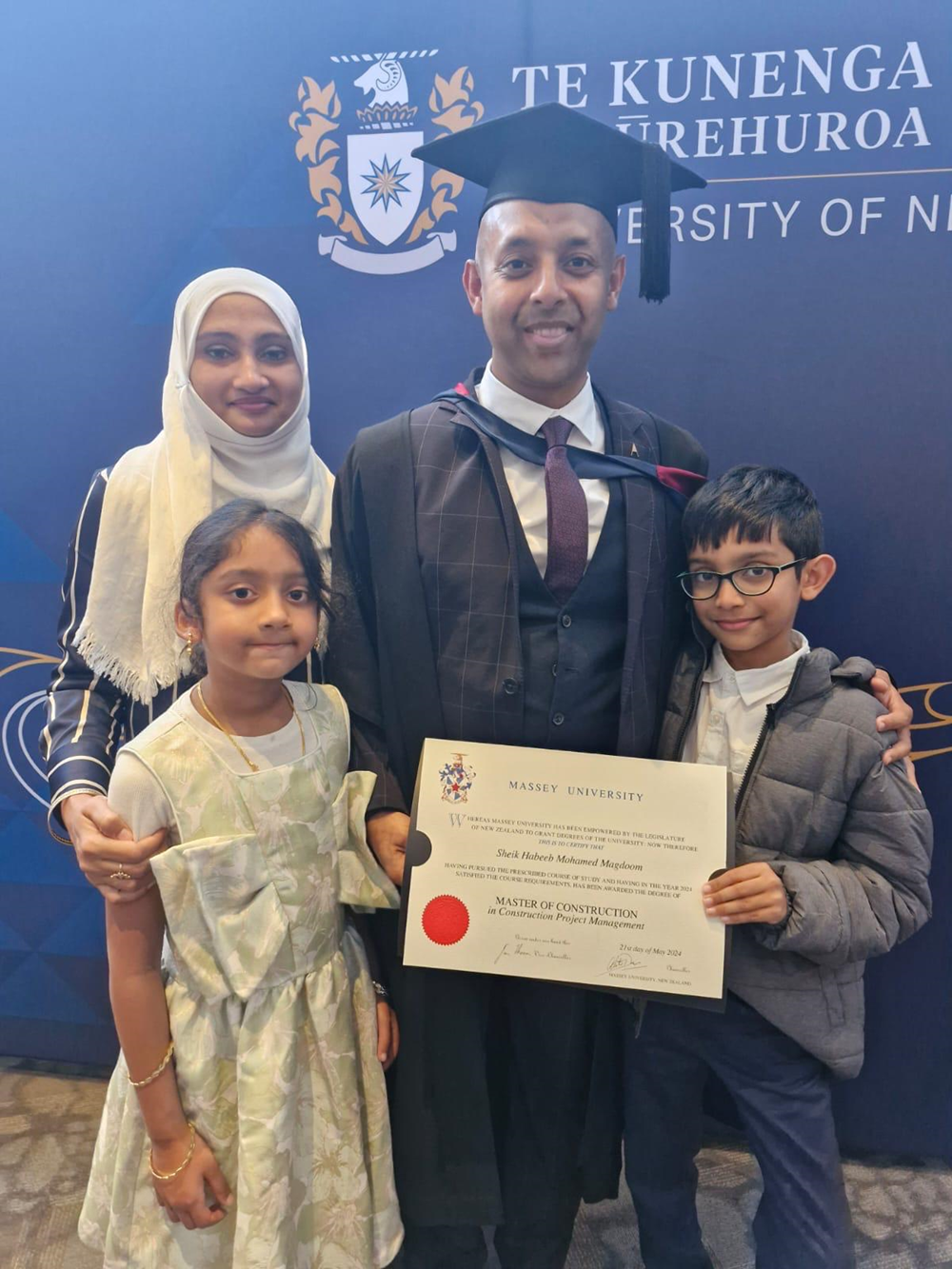 Sheik Habeeb Mohamed Magdoom, a father of two and an established architectural and construction professional from Dubai, UAE, embarked on a transformative journey at Massey University. After seventeen years of professional success, Sheik pursued his lifelong dream of earning a Master’s in Construction Management, a bold step supported wholeheartedly by his family.