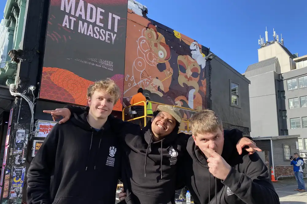Massey DJs Francis Elworthy, Riva Cowan & AJ Roberts on Cuba St for Wellington’s newest mural
